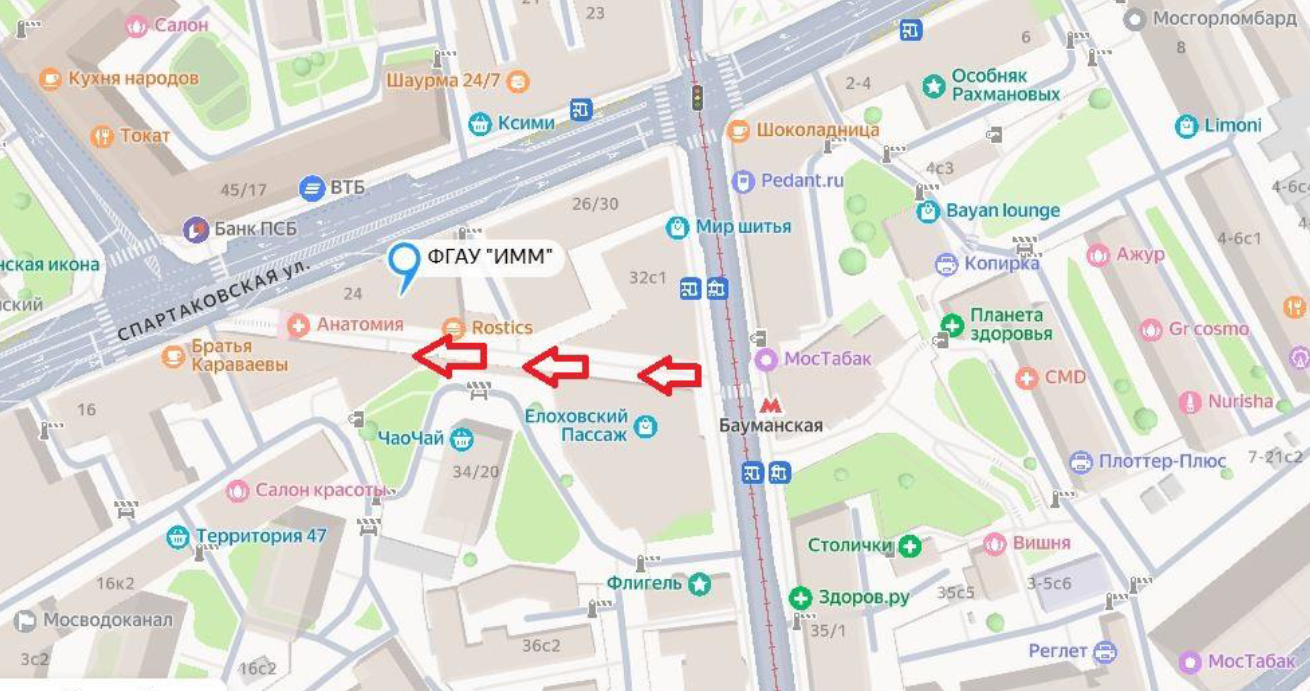 От выхода № 1 из станции метро «Бауманская» необходимо перейти через дорогу по пешеходному переходу в сторону Елоховского пассажа. Далее пройти между торговыми рядами Елоховского пассажа до здания ФГАУ «Институт медицинских материалов» Минпромторга России (см. изображения).