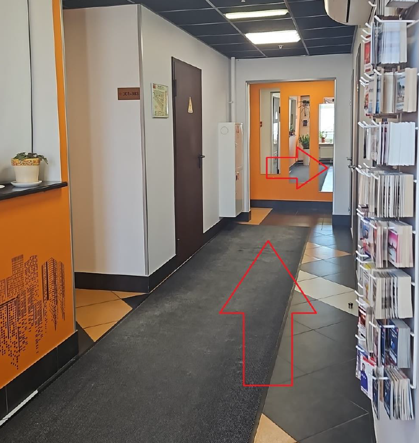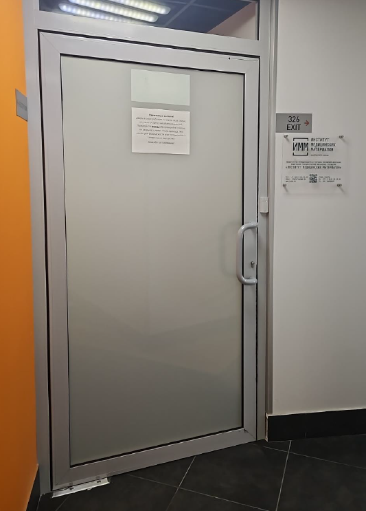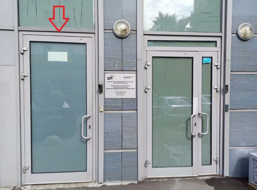 В здание возможен проход через дверь, которая расположена левее (см. изображения). Для входа необходимо нажать на кнопку звонка на домофоне, представиться (ФИО, организация) – секретарь откроет дверь. Далее подняться по лестнице, у входа в институт табличка ФГАУ «Институт медицинских материалов» Минпромторга России.
